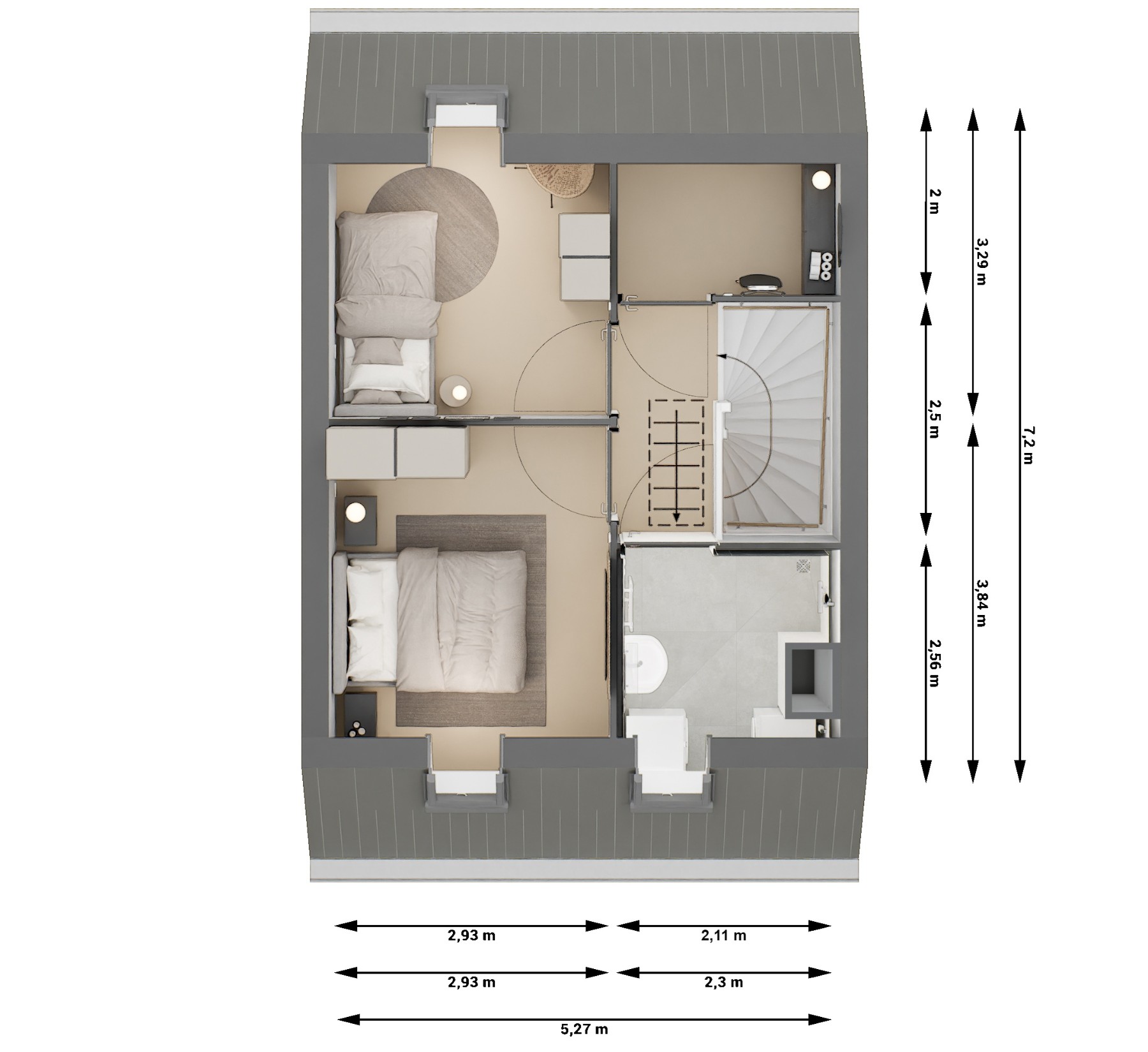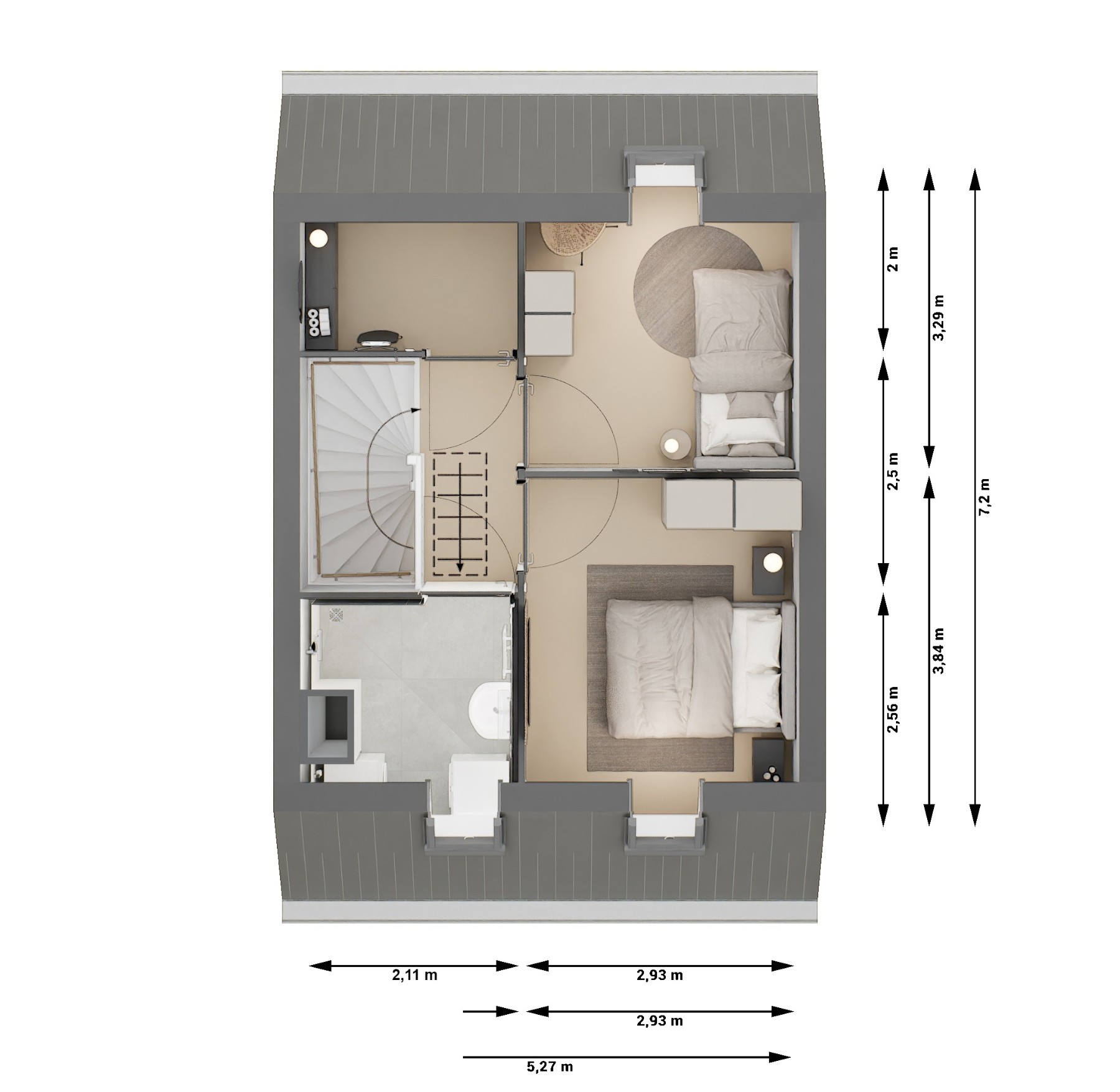 De Klaproos heeft twee slaapkamers op de eerste verdieping en een vliering onder de kap. Handig voor opslag van spullen die je niet dagelijks nodig hebt, maar wel bij de hand wilt hebben.